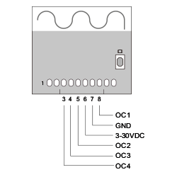 The open-collector outputs control connected devices according to the selected operating mode. The switched outputs OC1, OC2, OC3 and OC4 are permanently assigned to the button codes A, B, C and D.